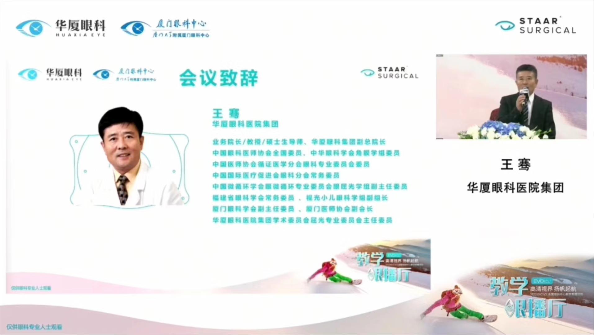會(huì)議伊始,廈門眼科中心業(yè)務(wù)院長(zhǎng)王騫教授發(fā)表開場(chǎng)致辭。他提到,讓患者擁有高清視界,是我們每位眼科醫(yī)生追求的目標(biāo),希望通過(guò)教學(xué)眼播廳活動(dòng),將手術(shù)規(guī)范化、專業(yè)化,提高眼內(nèi)屈光手術(shù)醫(yī)生的專業(yè)素養(yǎng),為更多近視患者帶去福音。