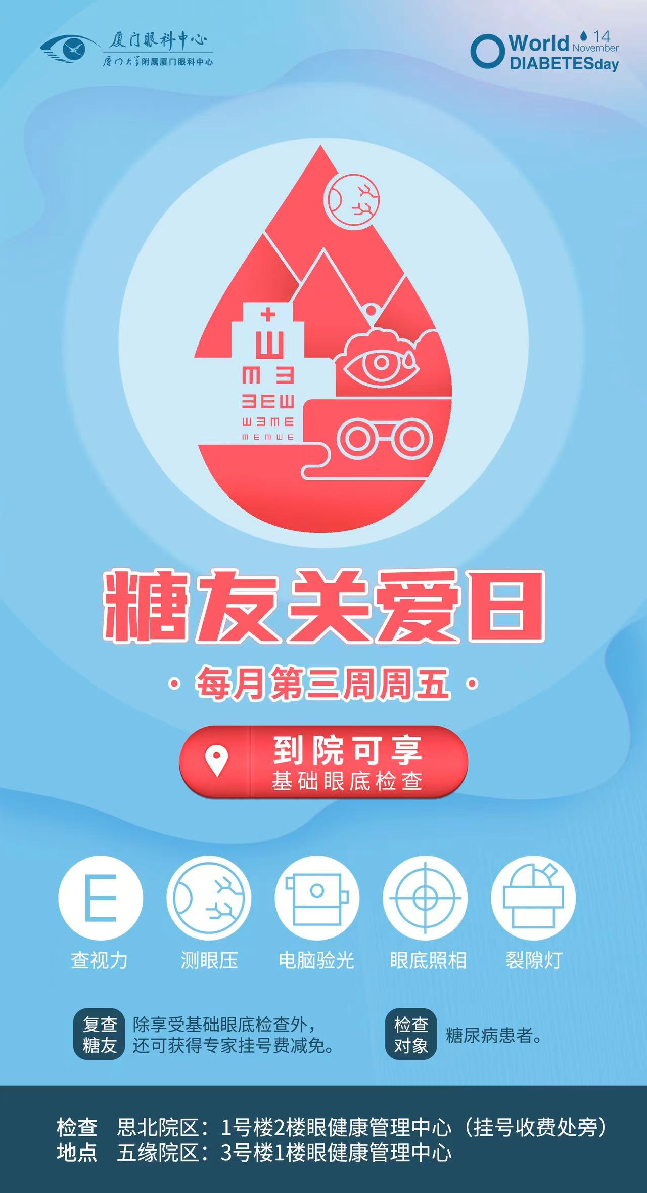 廈門眼科中心暖心設(shè)立糖友關(guān)愛日,每月第三周的周五糖尿病患者憑糖尿病診斷到院,即可免費(fèi)享受雙重驚喜福利。