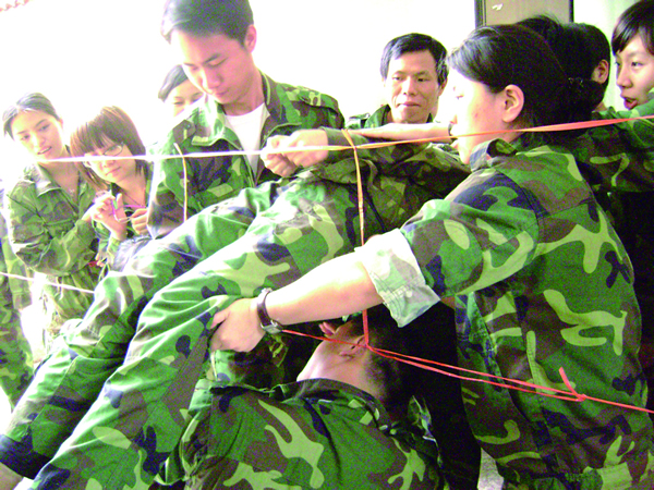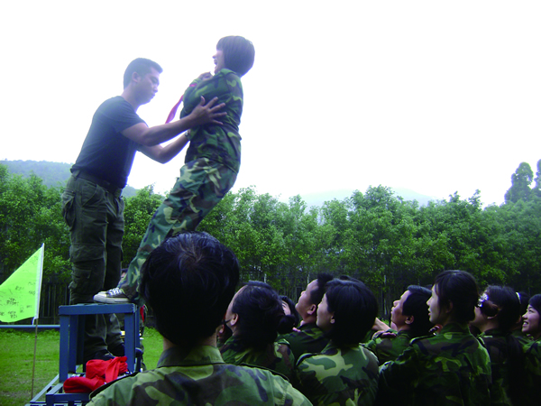 “相信大家,放心把你自己交給大家,你什么都不要想,大家會(huì)安全地把你接住”這是“信任背摔”項(xiàng)目的內(nèi)涵所在。項(xiàng)目形式是一個(gè)人站在4米高的位置,手被紅領(lǐng)巾綁住,然后在隊(duì)友“我們準(zhǔn)備好了,我們支持你,我們愛你”中從高空倒下,你的隊(duì)友們會(huì)用手臂把你安全接住,讓你感受團(tuán)隊(duì)?wèi)?zhàn)友的臂膀與赤誠。