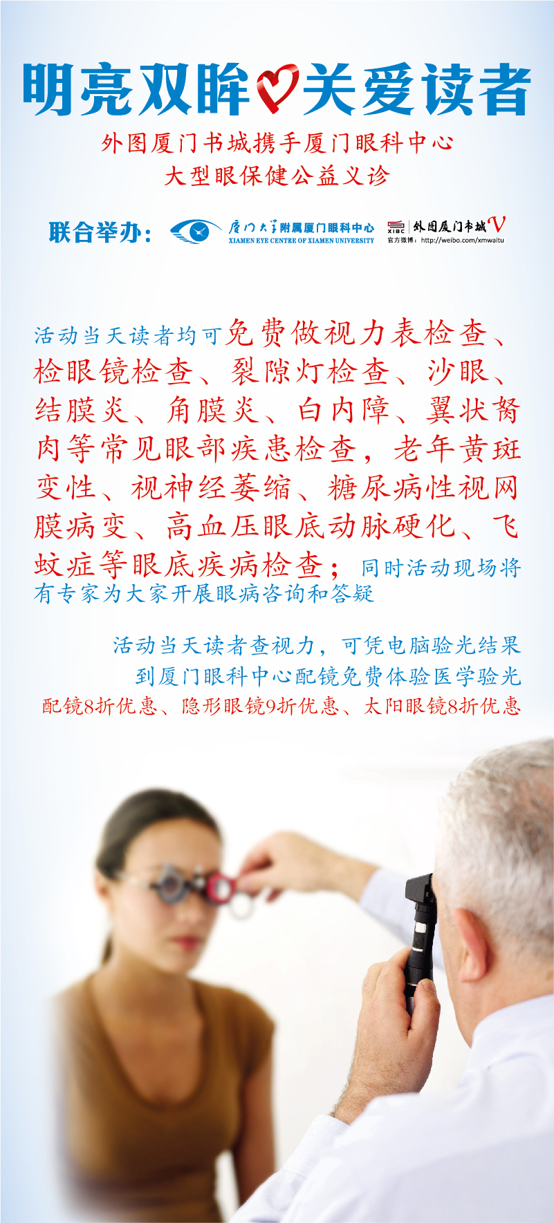 【文章導讀】6月29日(六)9:30-11:30,外圖廈門書城聯(lián)合廈門大學附屬廈門眼科中心開展明亮雙眸關愛讀者大型眼保健公益義診,歡迎有需要的讀者參加! 活動當天讀者均可免費做視力表檢查、檢眼鏡