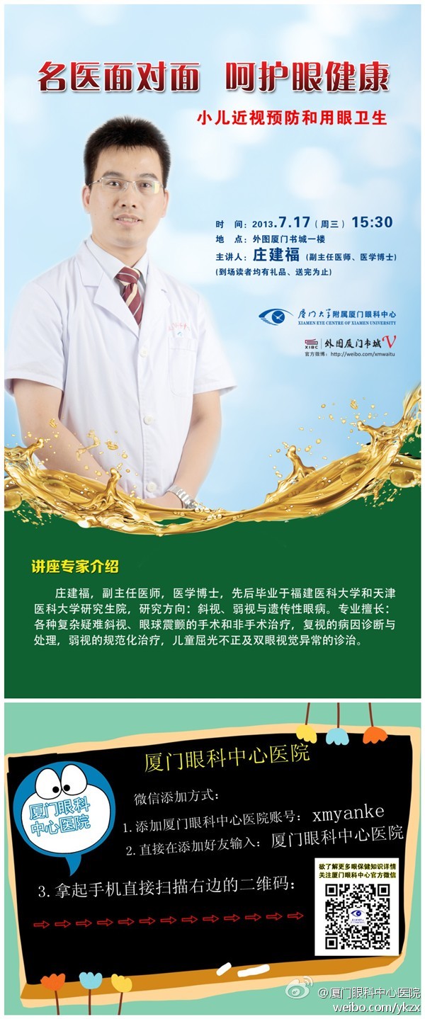 【文章導(dǎo)讀】2013年7月17日15:30分,廈門眼科中心小兒眼科莊建福博士將在外圖廈門書城一樓免費為青少年講述如何預(yù)防近視。現(xiàn)場將還有免費禮品贈送。