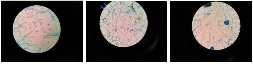 用「乳酸酚棉藍(lán)」染色,在顯微鏡下觀察菌絲及孢子可判斷真菌類型。