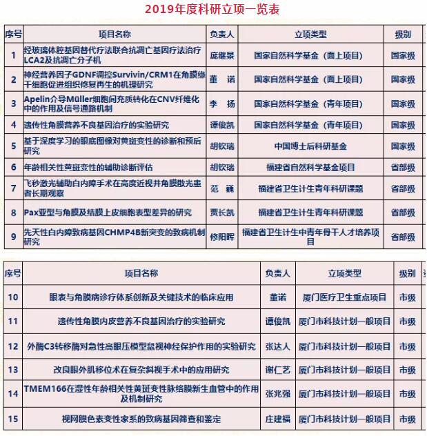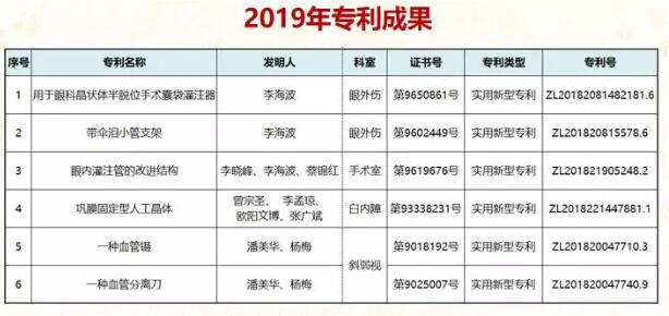 2019年全院發(fā)表SCI文章12篇,核心期刊文章31篇;5項(xiàng)專(zhuān)利獲得授權(quán);出版專(zhuān)著5部;在全國(guó)眼科年會(huì)投稿309篇,省級(jí)以上學(xué)術(shù)會(huì)議發(fā)言41人次。