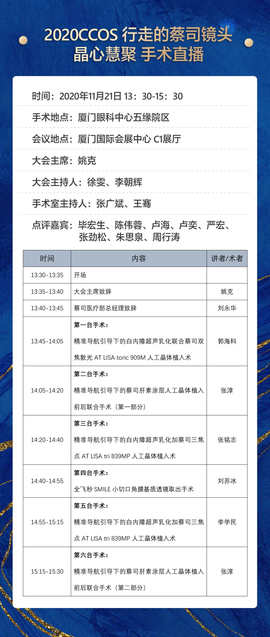 【文章導(dǎo)讀】2天4場直播,近20臺眼科手術(shù),涵蓋白內(nèi)障、青光眼、眼底、屈光等學(xué)科。如此手術(shù)直播盛宴,不容錯過! 11月21日至22日,在全國眼科年會(2020CCOS)期間,4場眼科手術(shù)實(shí)操技術(shù)云課堂