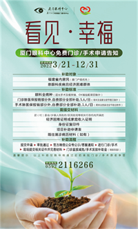 眼睛是心靈之窗,眼健康是國民健康的重要組成部分,也是反映人民群眾健康和幸福指標的一面鏡子。為深化落實“愛心廈門”行動及內(nèi)涵,提升人民群眾的獲得感、幸福感、安全感,滿足普遍、多樣的眼健康需求,2022年3月21日至12月31日,廈門眼科中心暖心啟動2022年“看見幸福”眼健康愛心公益項目,聚焦弱勢群體及重點眼病的困難救治,凡符合條件的患者均可申請專項愛心公益補助。