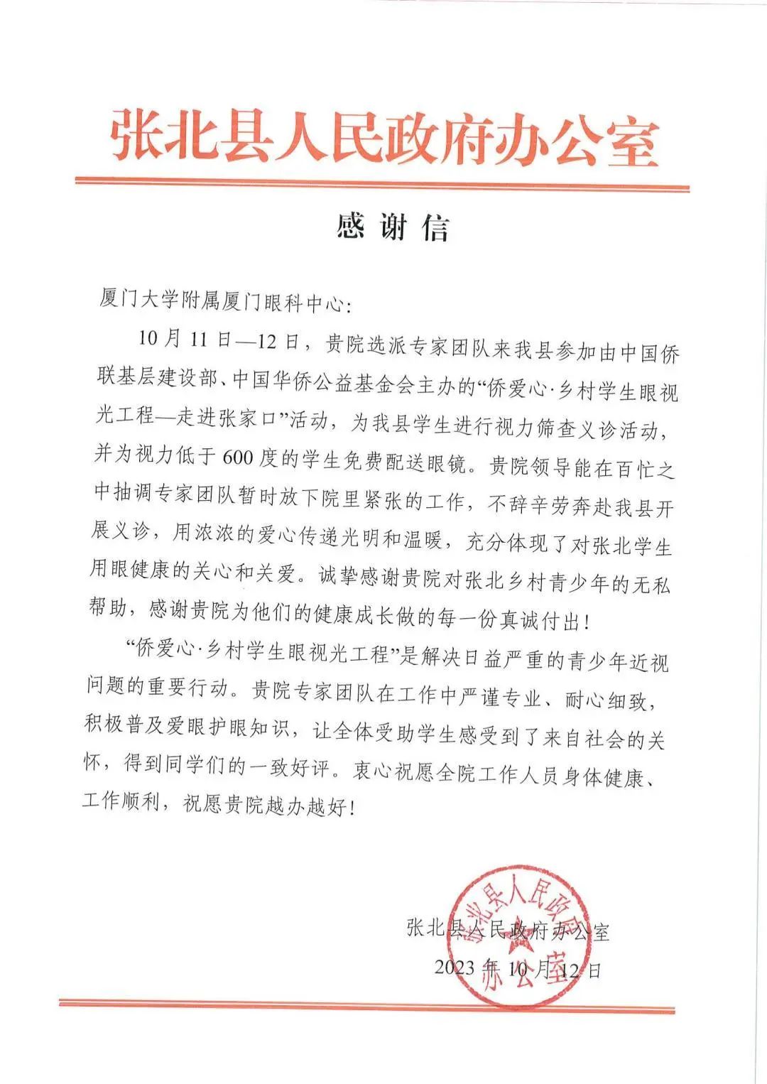 近日,廈門眼科中心接連收到來自中國僑聯(lián)基層建設(shè)部、懷安縣和張北縣人民政府辦公室的三封感謝信,信中對(duì)廈門眼科中心在“僑愛心·鄉(xiāng)村學(xué)生眼視光工程-走進(jìn)河北張家口”公益活動(dòng)中的無私付出及對(duì)鄉(xiāng)村孩子的寶貴的幫助給予充分認(rèn)可與真摯感謝。