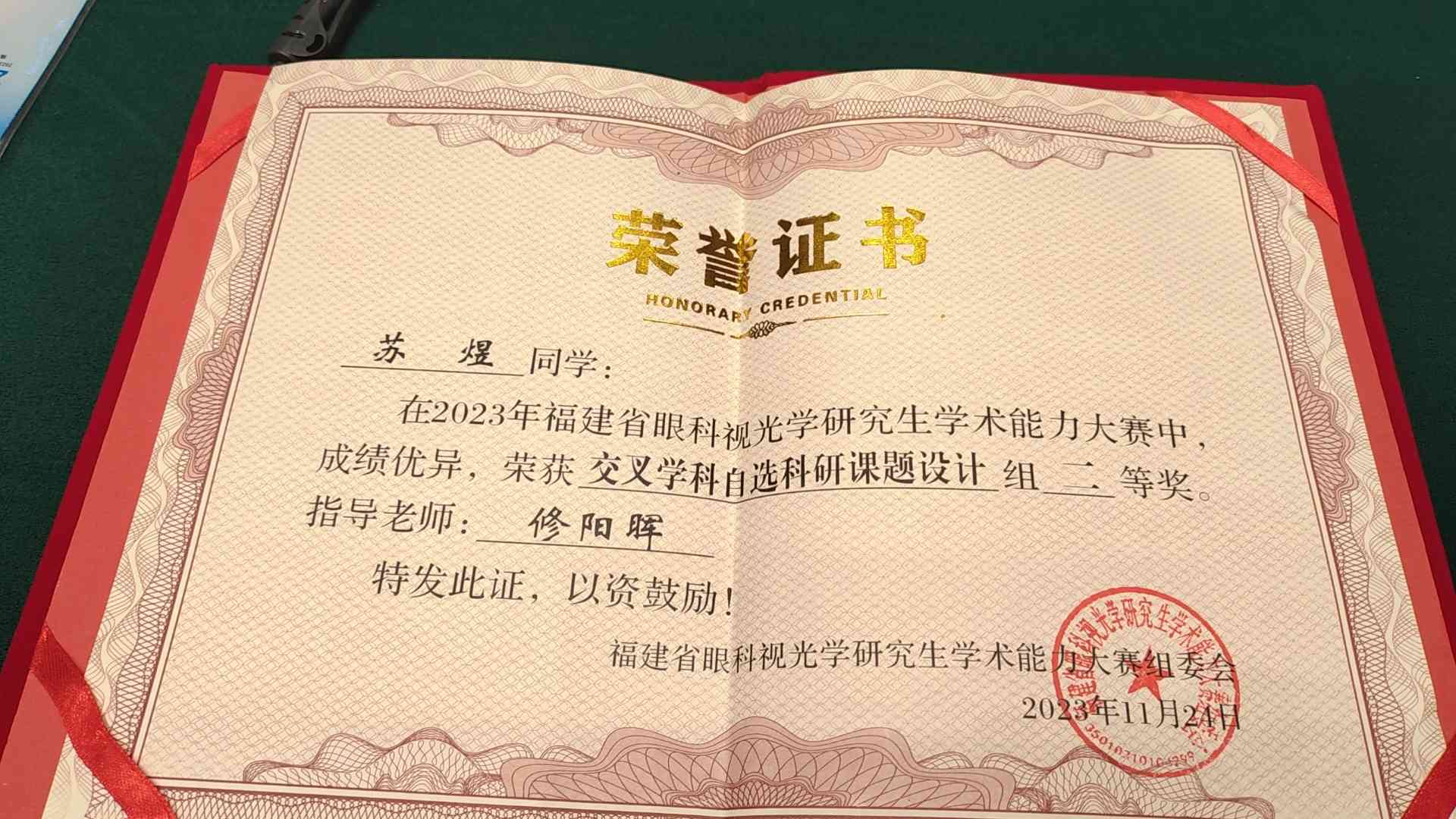廈門眼科中心斜視與小兒眼病中心修陽暉博士指導的2023級專業(yè)型碩士研究生蘇煜代表廈門大學參賽,以嚴謹?shù)目蒲兴悸放c臨床思維,展現(xiàn)出良好的精神風貌和綜合素質(zhì),獲得在場的專家評委一致好評,最終以總分全省第二的好成績斬獲“交叉學科自選課題組二等獎”。
