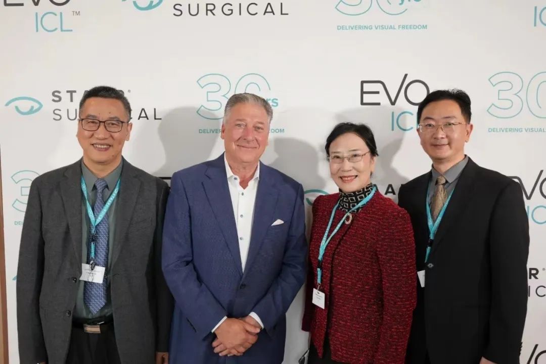 STAAR Surgical全球總裁 Tom Frinzi(左二)與廈門(mén)眼科中心屈光專(zhuān)家劉才遠(yuǎn)教授(左一)、陳亮教授(右一)合影留念