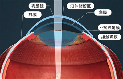 戴鞏膜鏡時(shí),能使鏡片隔著球結(jié)膜完全搭在鞏膜(白眼球上),在鏡片后表面與角膜前表面之前形成一個(gè)幾近封閉的液體儲留區(qū)(儲留生理鹽水)。
